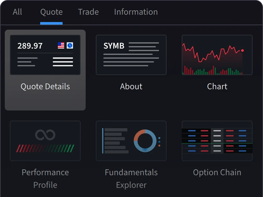 在一个屏幕上交易股票、期权、期货、货币、债券和基金。