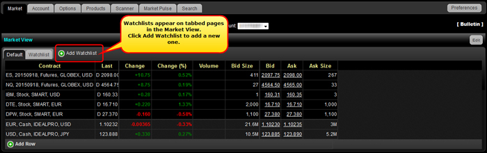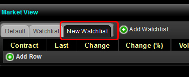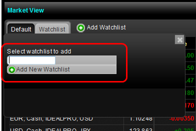 Tickers in the Market View are grouped into Watchlists. You can create new watchlists directly on the Market View, and then add tickers to those Watchlists.